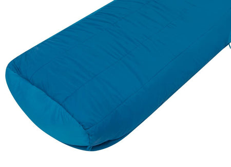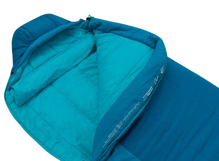 En tvåvägs fullängdsdragkedja på vänster sida, kompletterad med en separat fotdragkedja, gör det möjligt att förvandla sovsäcken till ett helt täcke när temperaturen stiger.